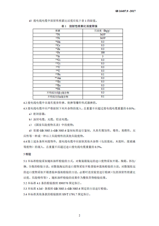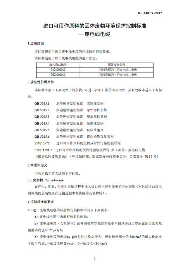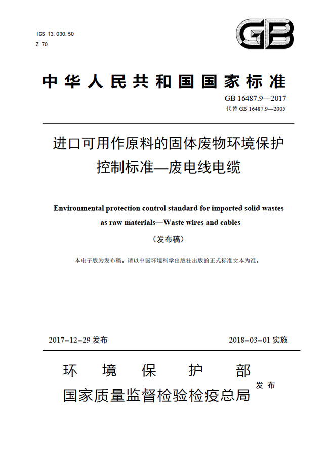 為貫徹《中華人民共和國固體廢物污染環境防治法》《中華人民共和國放射性污染防治法》等法律法規,控制由于進口可用作原料的廢電線電纜造成的環境污染,制定本標準。本標準規定了進口廢電線電纜的環境保護控制要求。本標準是進口固體廢物環境保護系列控制標準之一,適用于進口可用作原料的固體廢物目錄中有關廢電線電纜的進口管理。