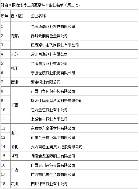 根據《銅冶煉行業規范條件》(工業和信息化部公告2014年第29號),經企業申報、省級工業和信息化主管部門核實、專家組審核、現場核查及網上公示,現將符合《銅冶煉行業規范條件》企業名單(第二批)予以公告。