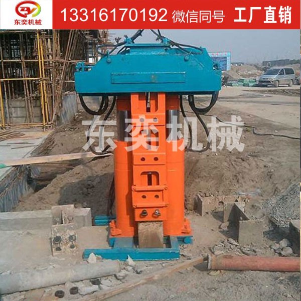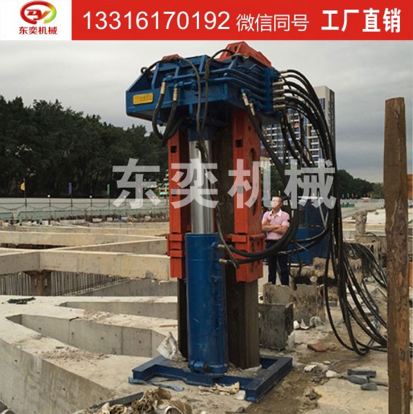 工作原理: 工法型鋼拔樁機利用其夾樁器夾住樁頭,液壓缸強制頂壓夾樁器,使之向上頂升一段距離,將樁逐段拔出,適用在粘土、砂土或含少量礫石的土層中拔工字鋼或型鋼樁。