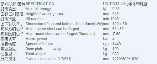 C41-40KG單體空氣錘(連體空氣錘)帶底座,安裝方便,其在原來單體空氣錘的基礎上安裝一個基礎底座,保證其正常工作穩定,同時電機、皮帶、皮帶罩也都模塊化設計與底座一體結構,這樣不但結構合理,而且工作穩定,效率高;同時減少安裝時間,更加方便移動安裝。